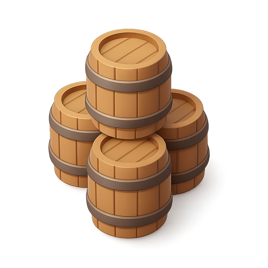 /Collection: /by davooda/Type: PNG/A visually appealing 3D icon representing a stack of wooden barrels. The barrels are depicted in a three-quarter isometric view, showcasing their rounded shapes and wooden texture against a soft gradient background.