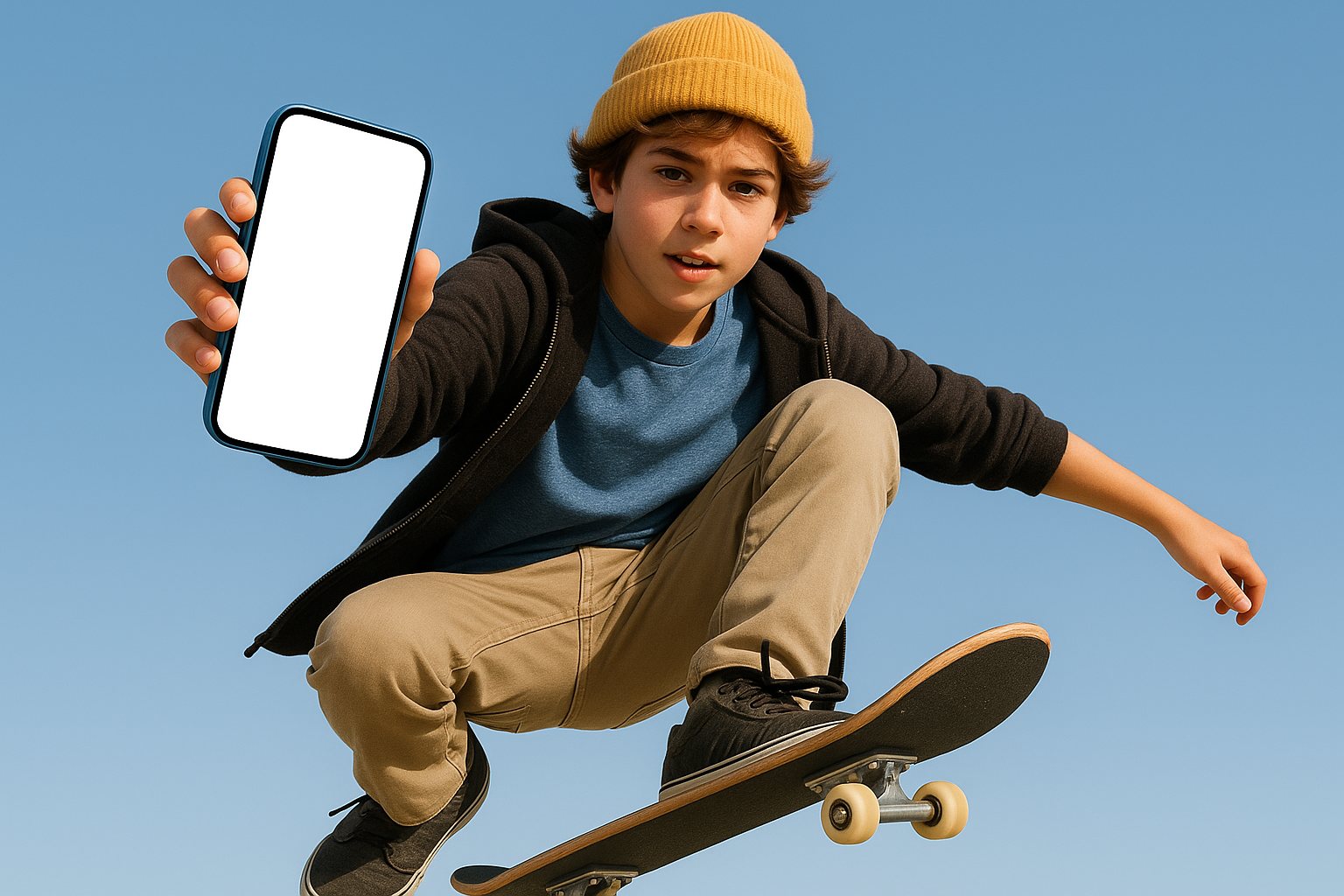 A young skateboarder performs a jump while holding a smartphone with a blank screen. He wears a yellow beanie, a blue shirt, and beige pants, against a clear blue sky.