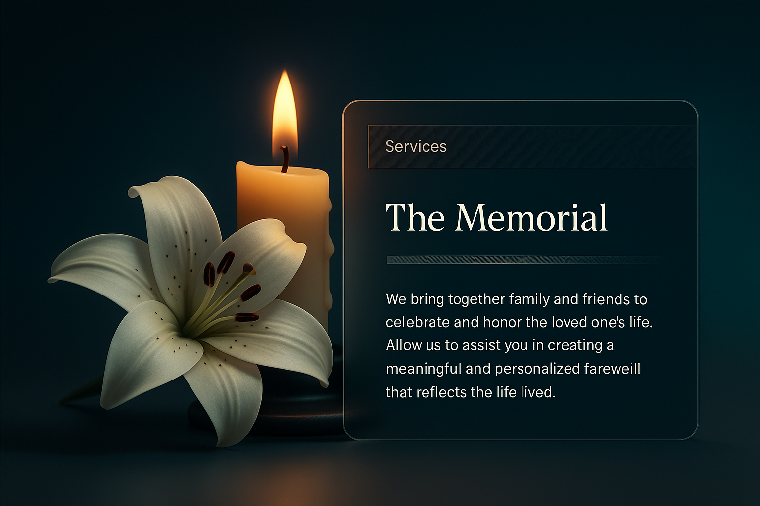A serene composition featuring a white lily beside a lit candle on a dark background. The scene evokes a sense of remembrance and peace, suitable for a memorial context.