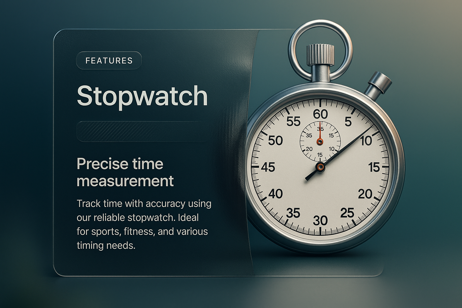 A visually appealing 3D illustration of a stopwatch, integrated with a dark transparent overlay showcasing features. The background features a smooth gradient, enhancing the design's realism.