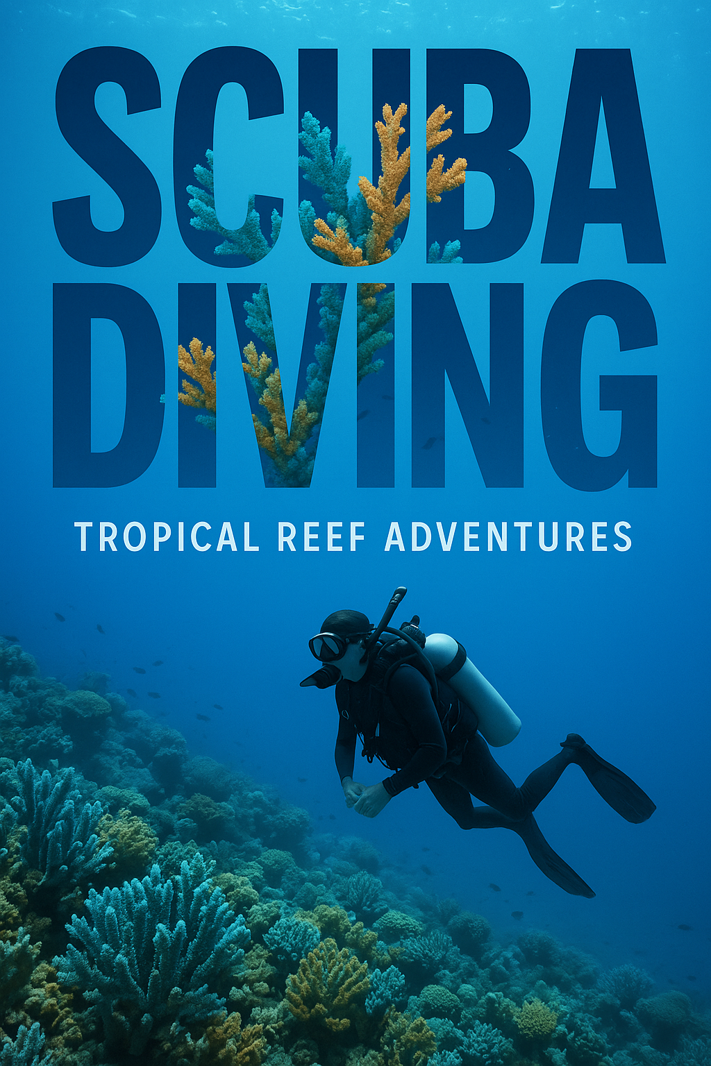 Vibrant underwater scene showcasing a scuba diver exploring a tropical reef, ideal for promoting diving adventures and marine tourism.