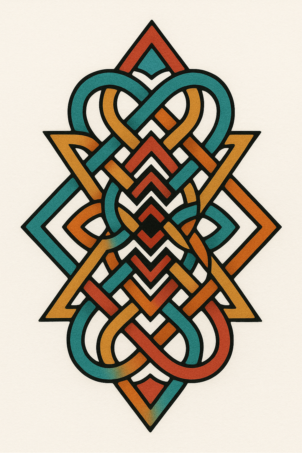 A visually striking geometric design featuring intertwined shapes and vibrant colors, perfect for decorative art or textile patterns.