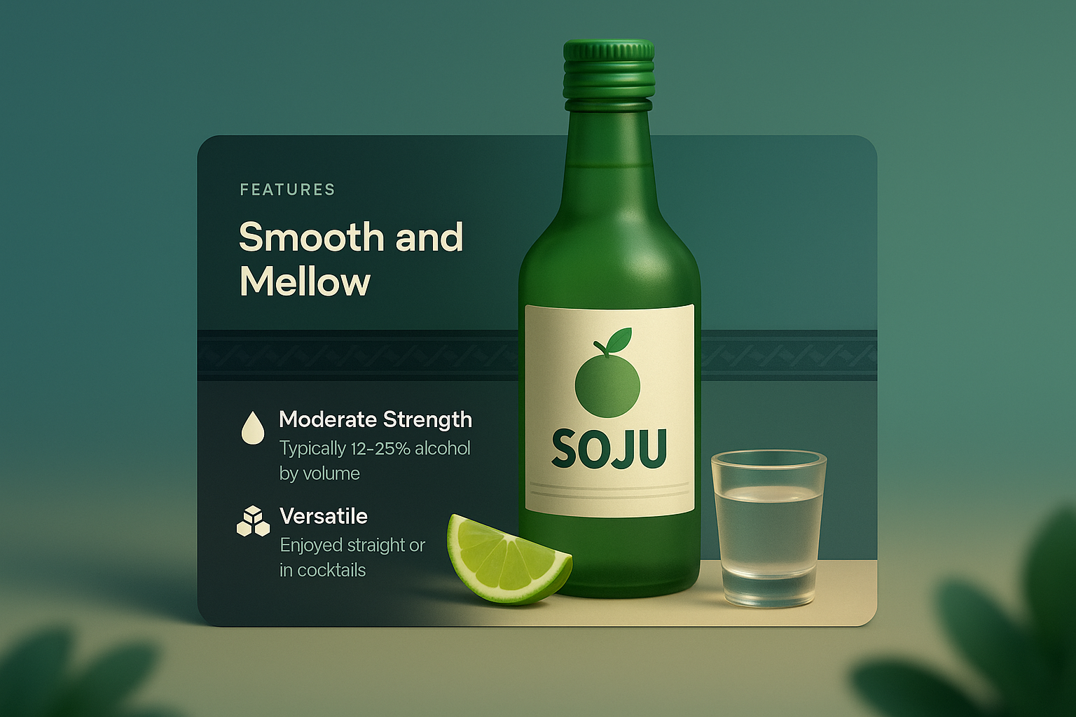 /Collection: /by davooda/Type: PNG/A 3D illustration showcasing a soju bottle with a label, accompanied by a glass and lime slice. The features are presented on a dark panel integrated into the image.