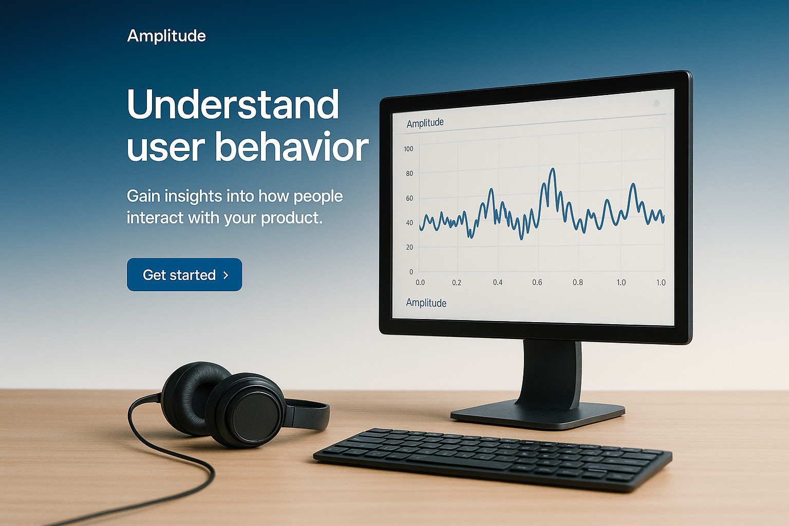 A modern desktop setup featuring a monitor displaying user behavior analytics, alongside headphones and a keyboard, set against a gradient background.