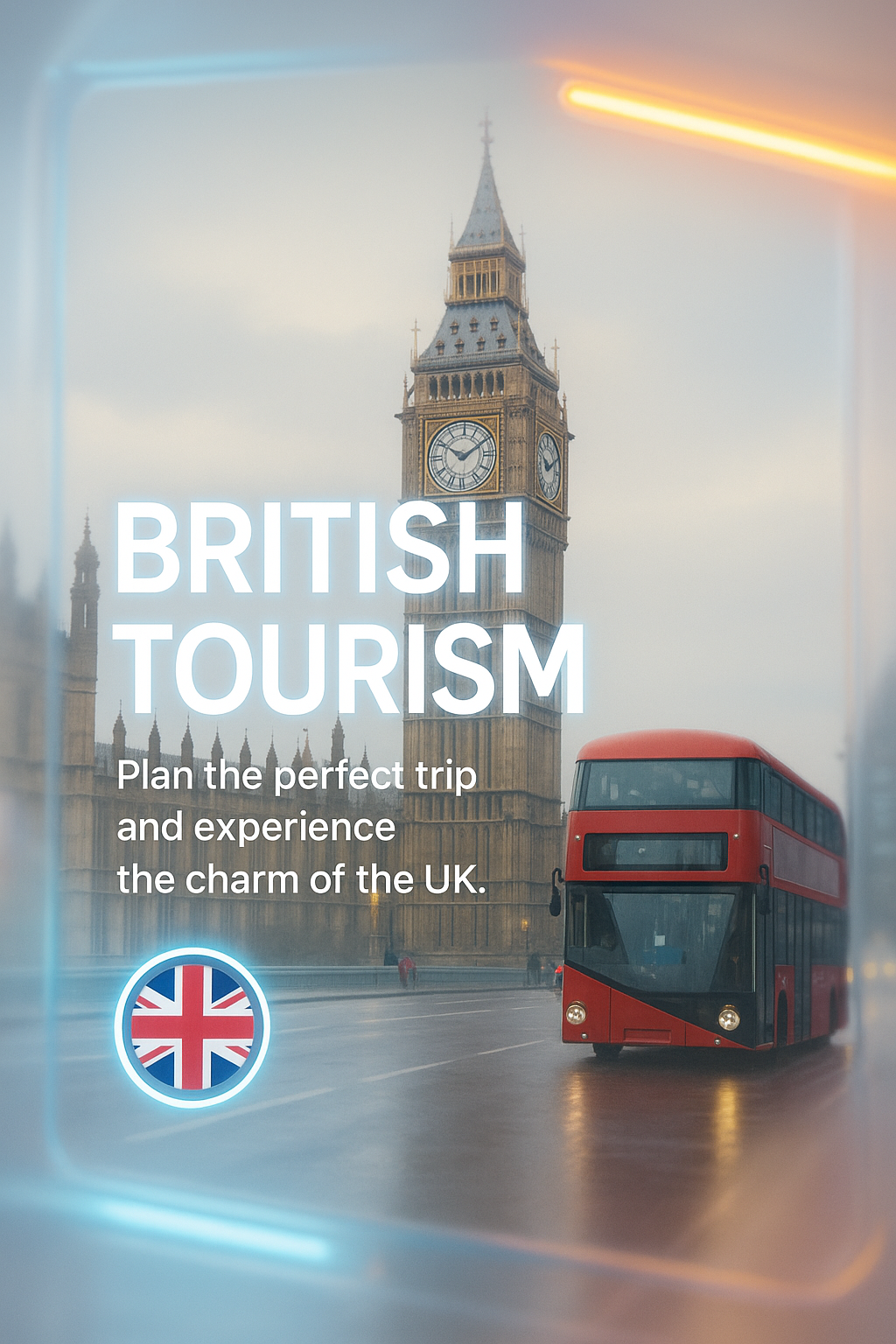 Dynamic promotional graphic showcasing British tourism, featuring a red double-decker bus and Big Ben, designed to attract travelers to the UK.