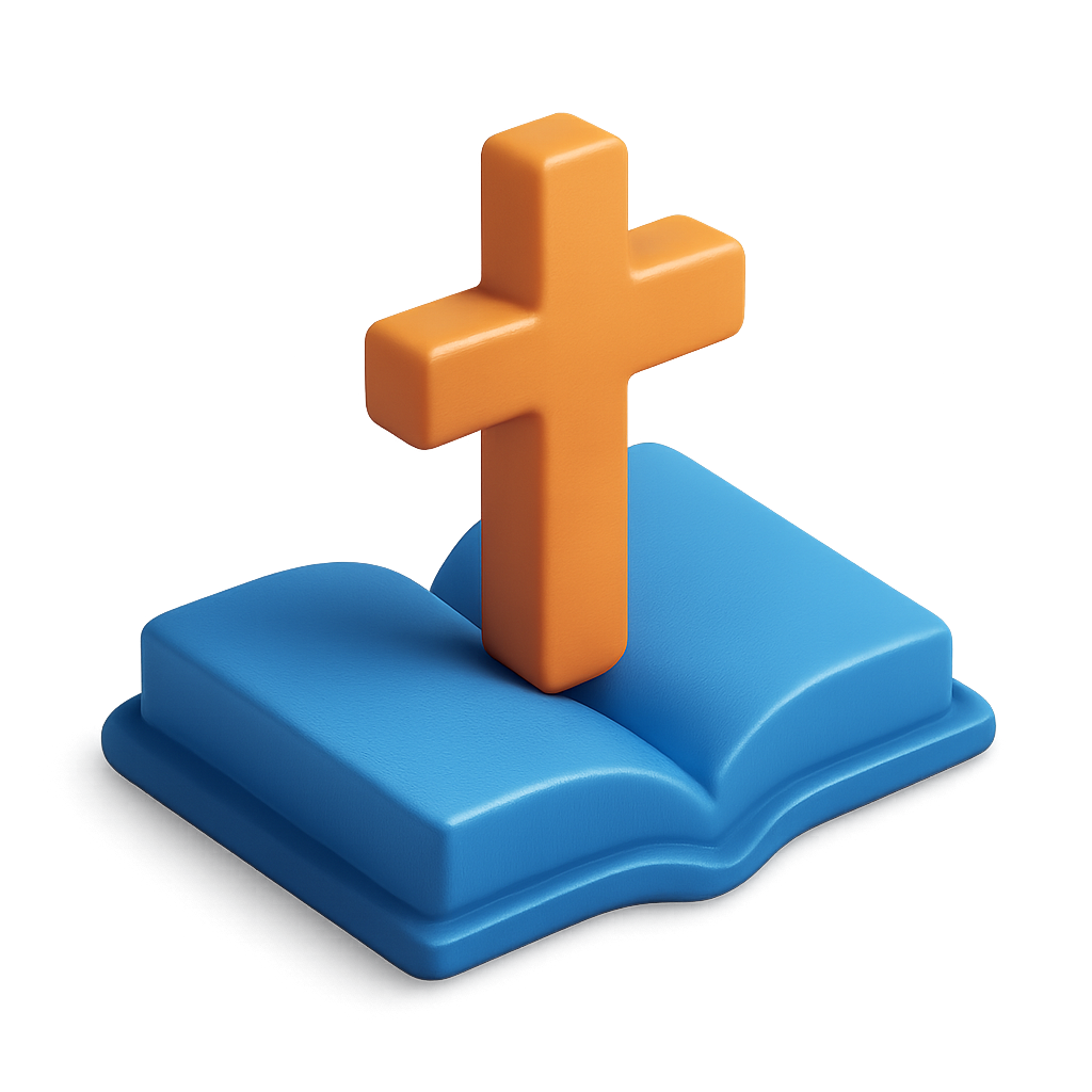 A vibrant 3D icon featuring an orange cross atop a blue book, designed with a transparent background. The isometric view enhances its volumetric feel, symbolizing belief.