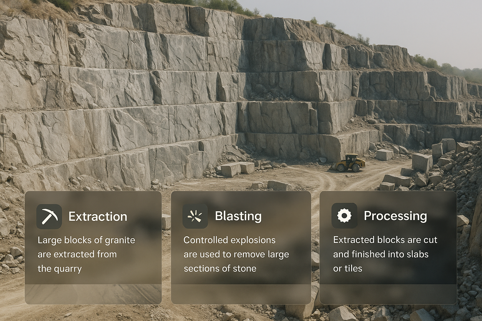 /Collection: /by davooda/Type: PNG/An image of a granite quarry featuring large stone blocks and machinery. Overlayed are three horizontal blocks with titles and descriptions about extraction, blasting, and processing.