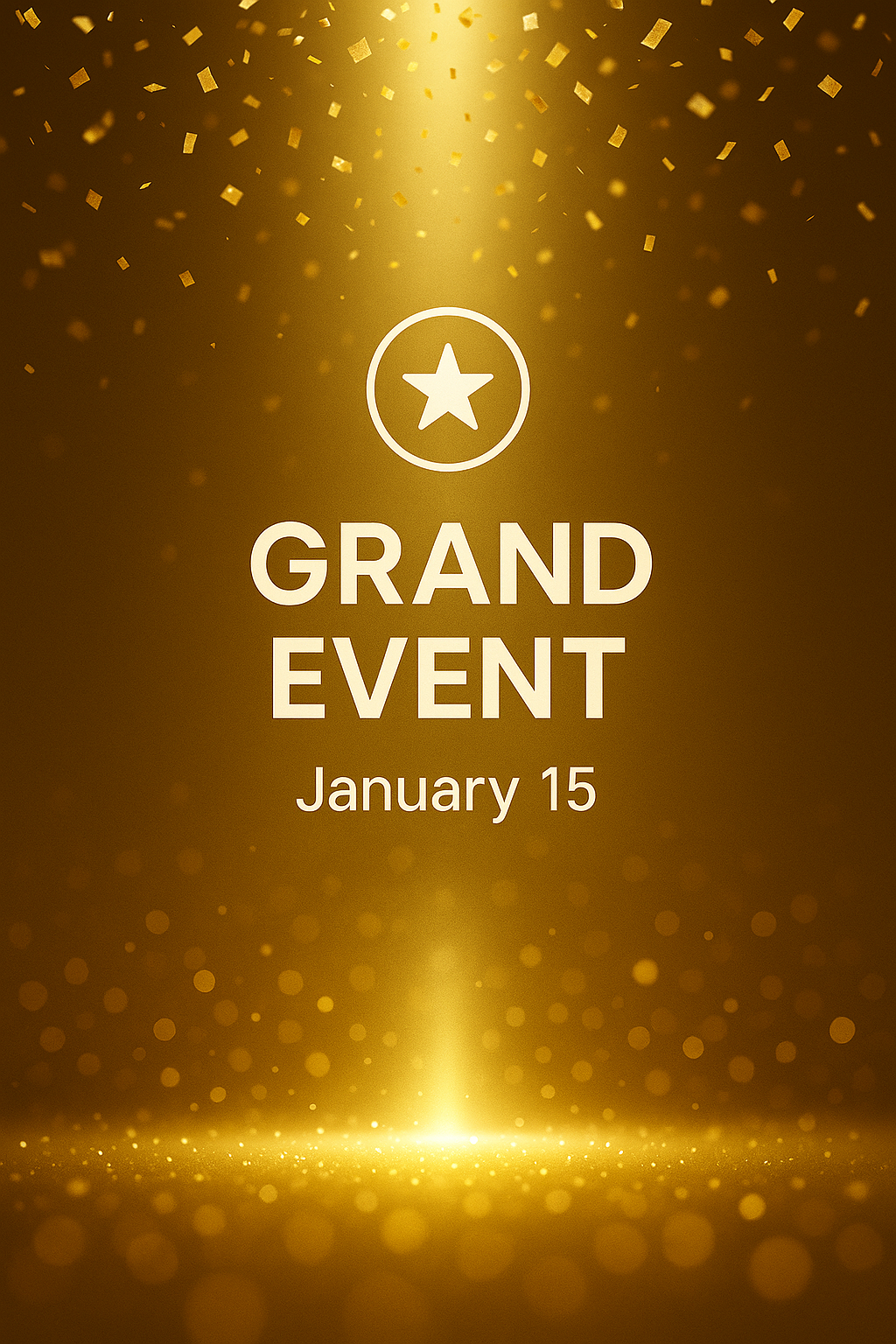 A sophisticated promotional graphic featuring a golden theme and sparkling elements, perfect for event announcements and marketing.