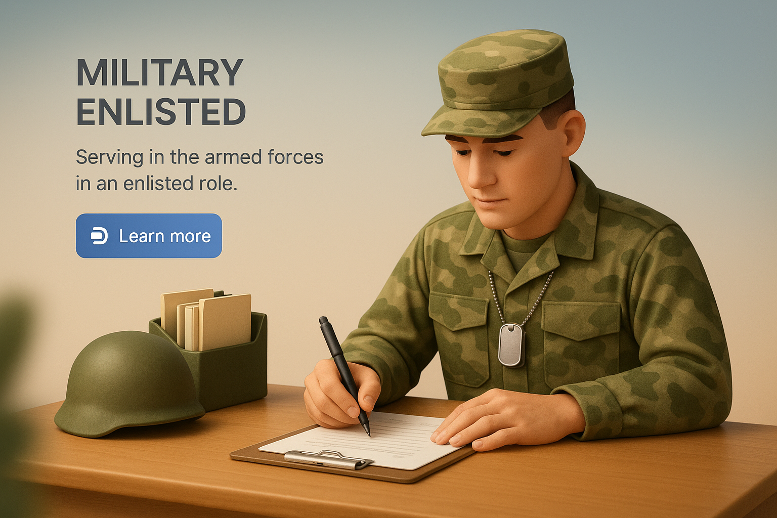 /Collection: /by davooda/Type: PNG/A detailed 3D illustration depicting a soldier in camouflage writing notes at a desk. The scene includes military gear, a helmet, and a call-to-action button.