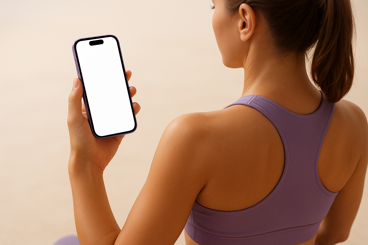 /Collection: /by davooda/Type: PNG/A woman in athletic wear holds a purple phone with a blank screen, captured from behind. The image emphasizes the contours of her shoulder and the phone's sleek design.