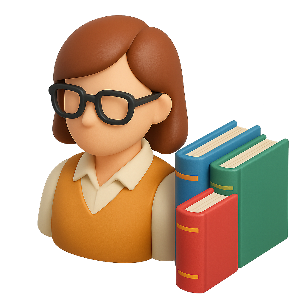 A 3D representation of a librarian with glasses, featuring a stylized character design alongside colorful books. The icon has a transparent background and a three-quarter isometric view.