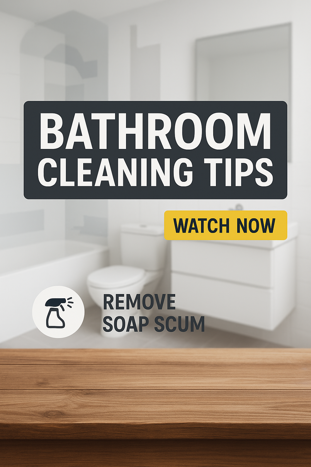 Engaging social media post designed to promote bathroom cleaning tips with a modern and clean aesthetic, appealing to homeowners and cleaning enthusiasts.