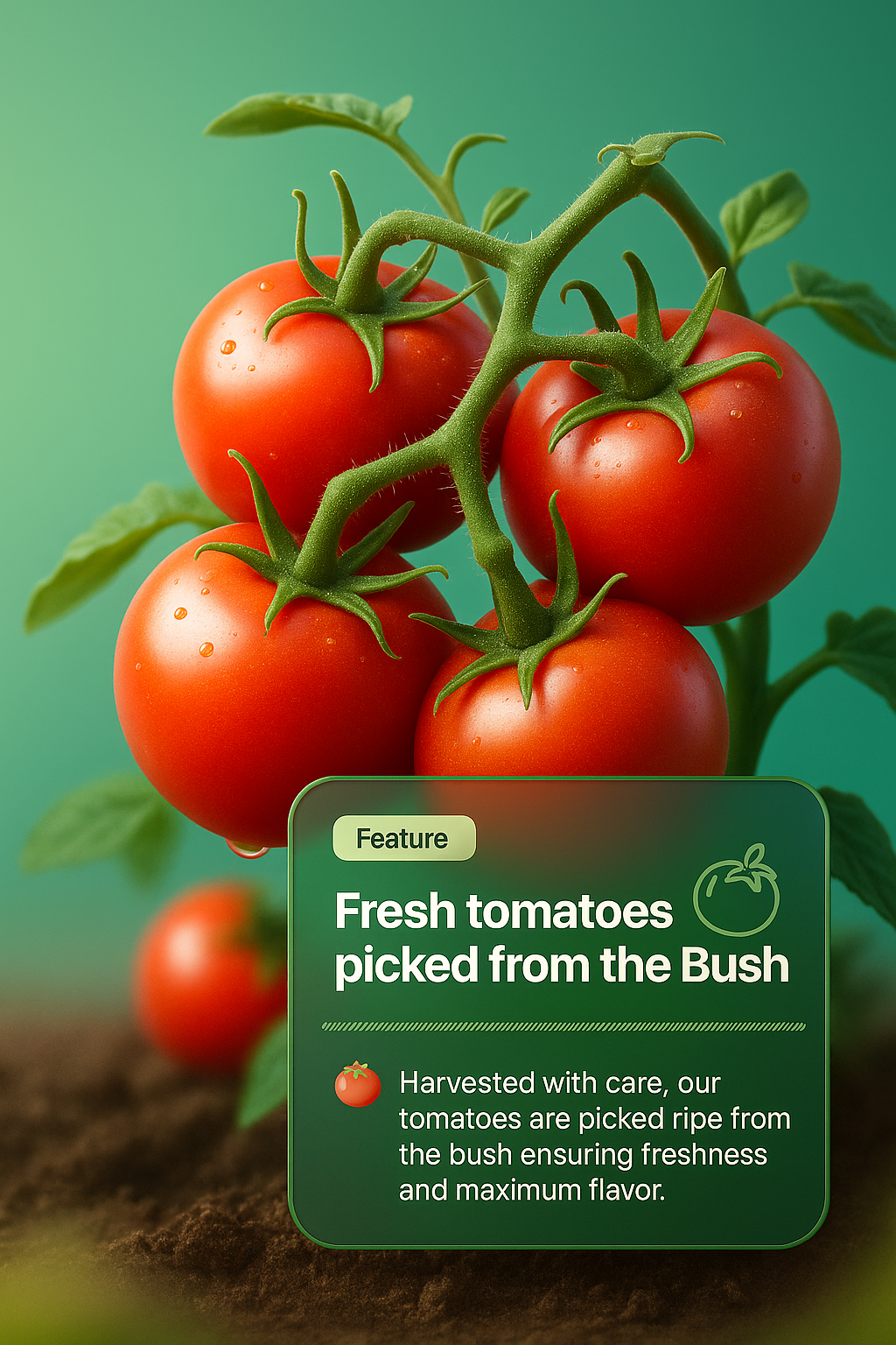 A vibrant 3D illustration of fresh tomatoes, showcasing their rich color and natural surroundings. The design integrates a feature block with text, enhancing the visual appeal.