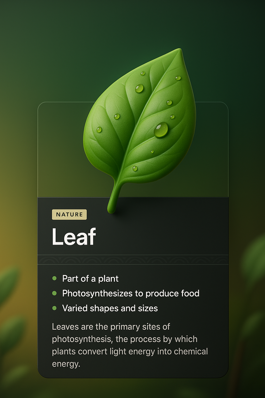 /Collection: /by davooda/Type: PNG/A vibrant 3D illustration of a green leaf featuring dew drops, integrated with a stylish black information block. The design merges natural elements with digital aesthetics, suitable for web presentation.