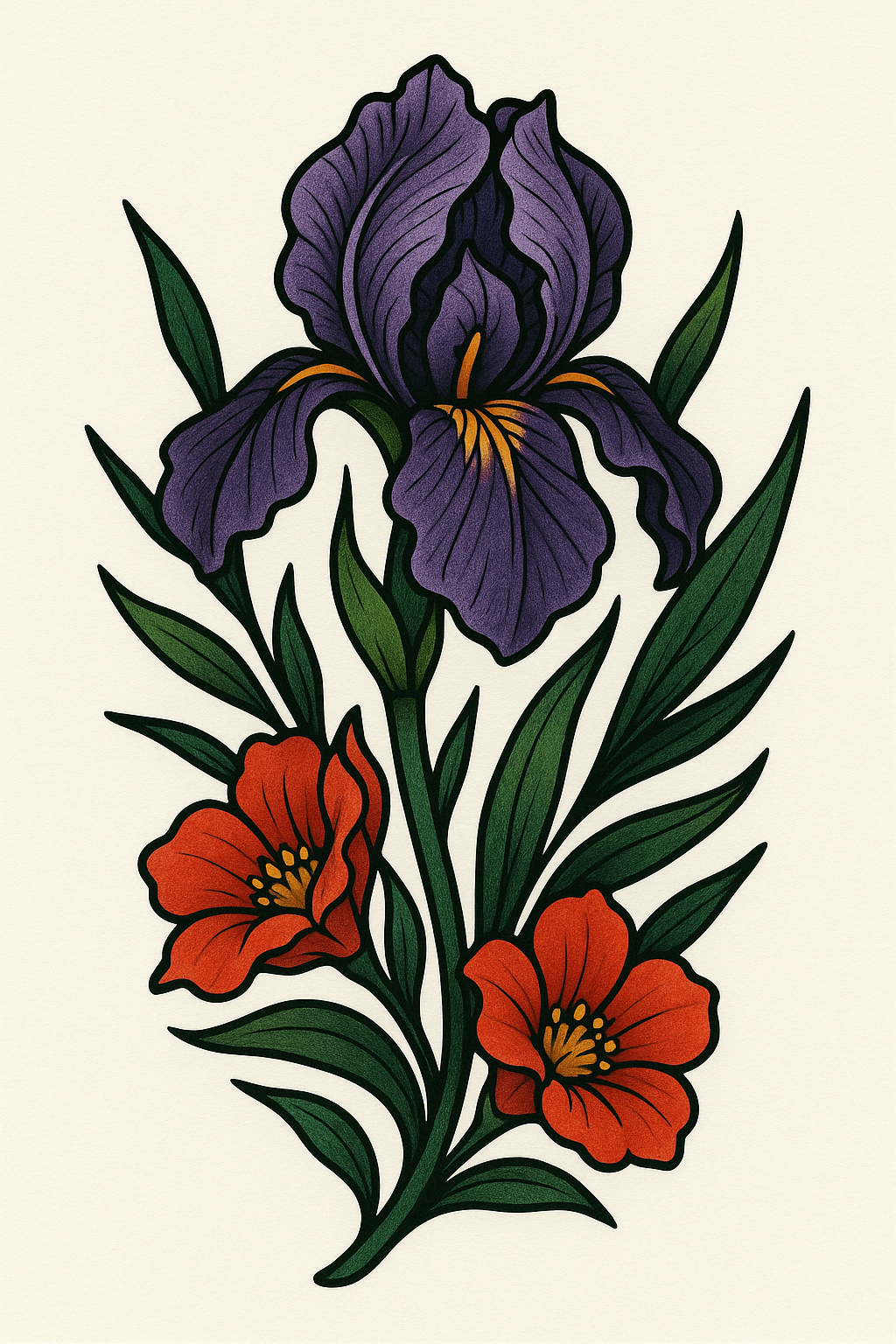 /Collection: /by davooda/Type: PNG/Vibrant botanical artwork showcasing a purple iris and red-orange flowers, designed with bold lines and rich colors, perfect for decor or nature-themed projects.