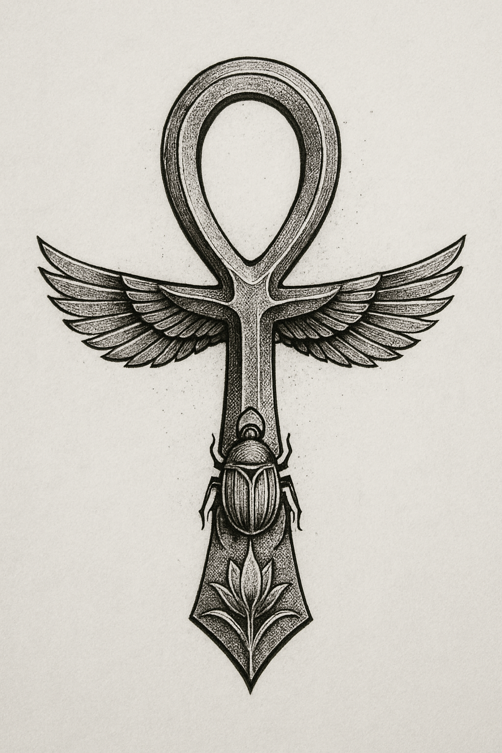 Intricate Ankh Symbol with Wings and Scarab Illustration