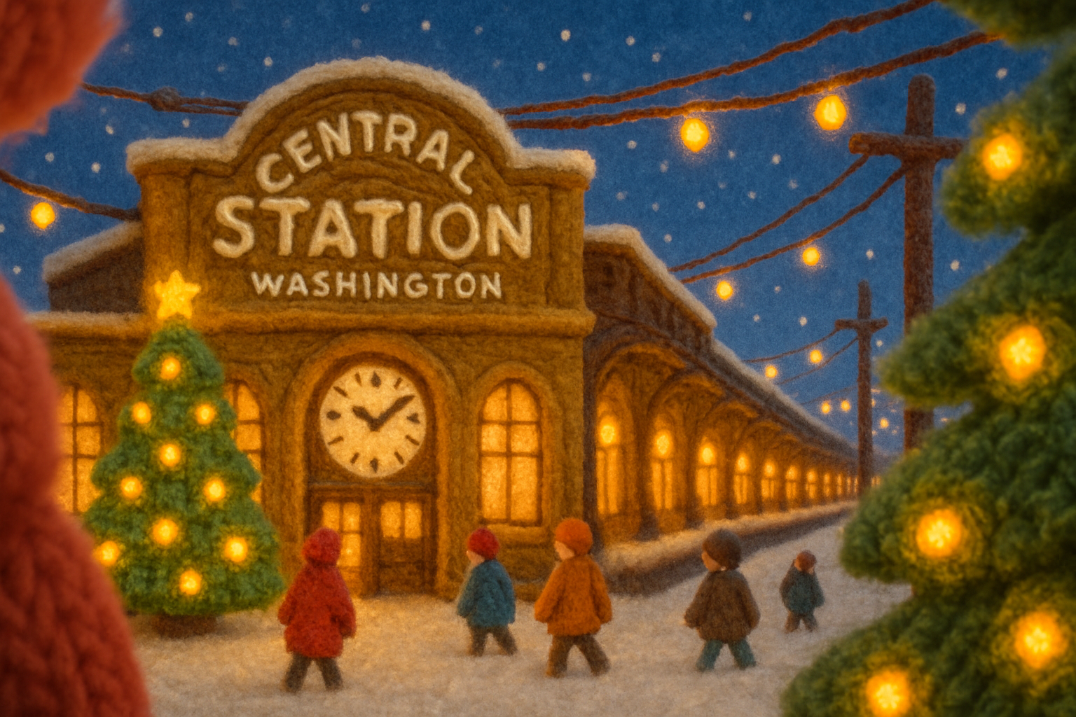 A whimsical 3D scene of Central Station, Washington, crafted from yarn-like textures. The image features a cozy atmosphere with a snowy backdrop, illuminated by warm lights and tiny figures walking by.