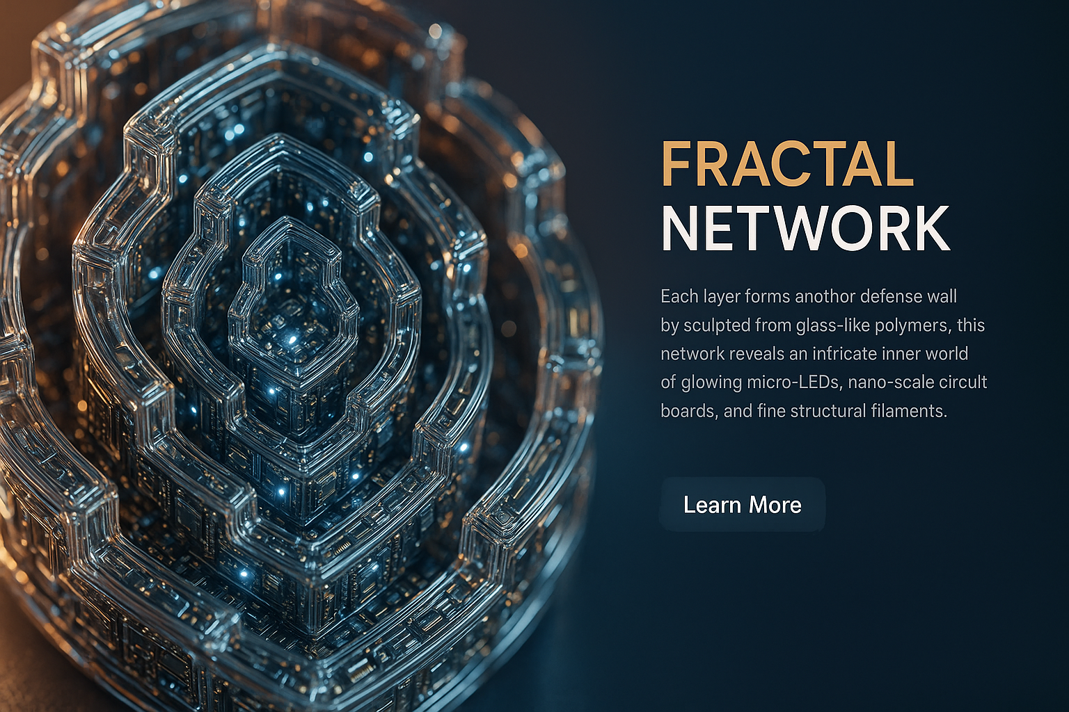 /Collection: /by davooda/Type: PNG/The image showcases a hyperrealistic fractal network, intricately designed with glass-like polymers and illuminated by glowing micro-LEDs. The composition emphasizes clean lines and metallic reflections.
