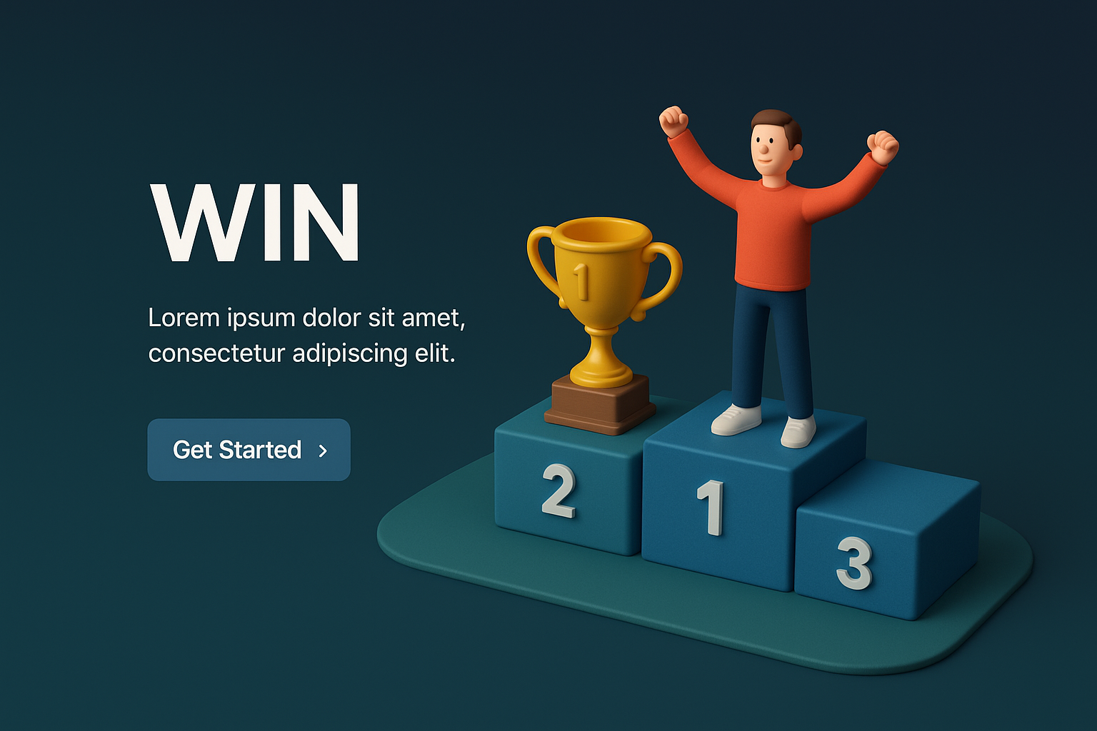 /Collection: /by davooda/Type: PNG/A zoomed-out 3D scene showcasing a character celebrating victory on a podium with trophies. The background features a dark gradient, enhancing the vibrant visual elements.