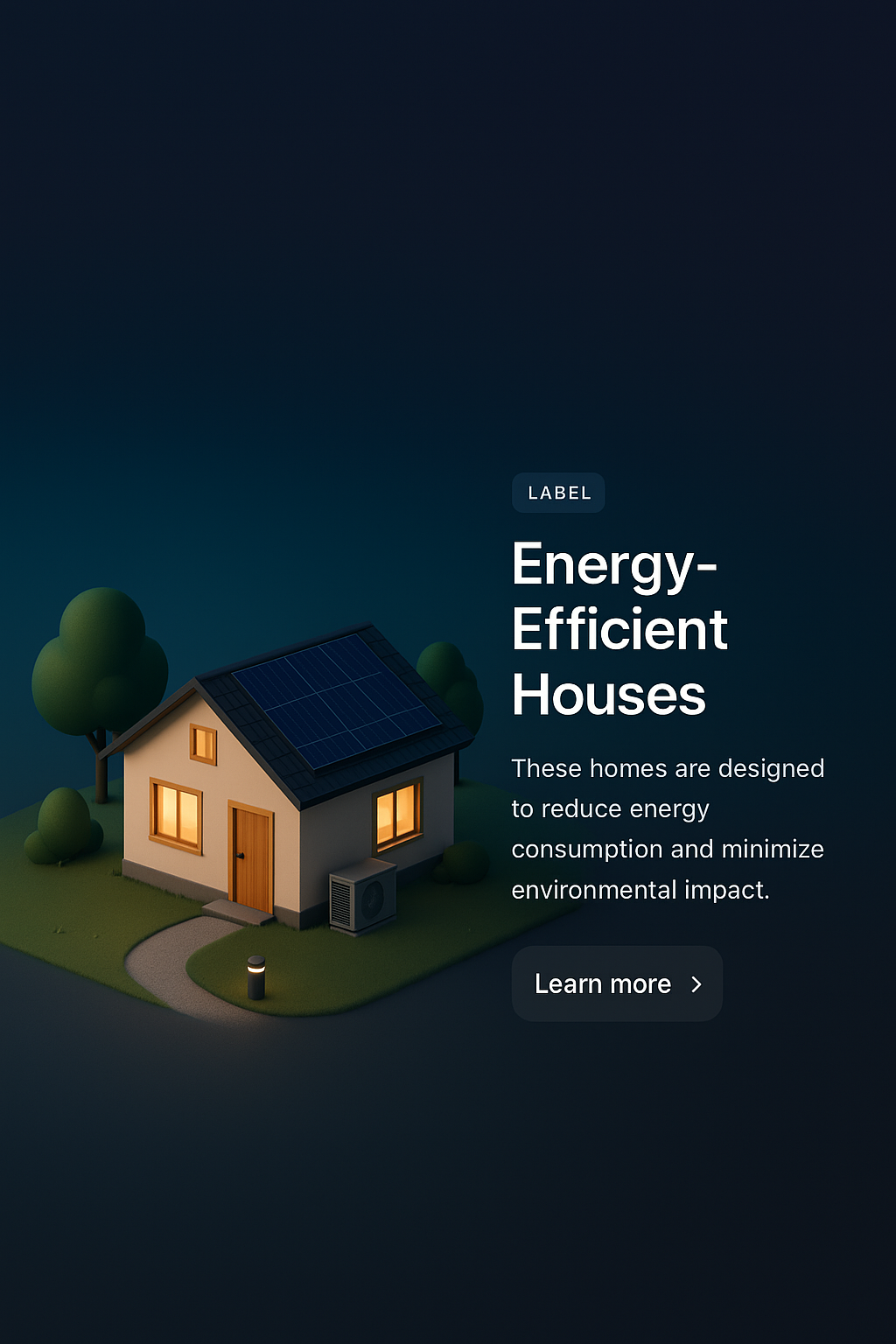 A 3D scene showcasing a small energy-efficient house with solar panels, set against a dark gradient background. The design includes a label and a short description, emphasizing minimal environmental impact.