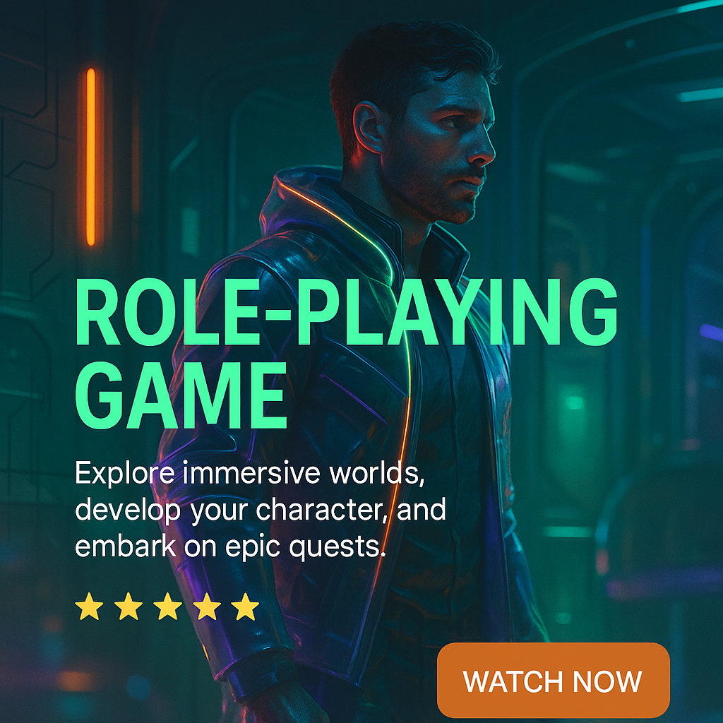 Vibrant promotional image for a role-playing game featuring a character in a futuristic environment. Ideal for social media or gaming advertisements.