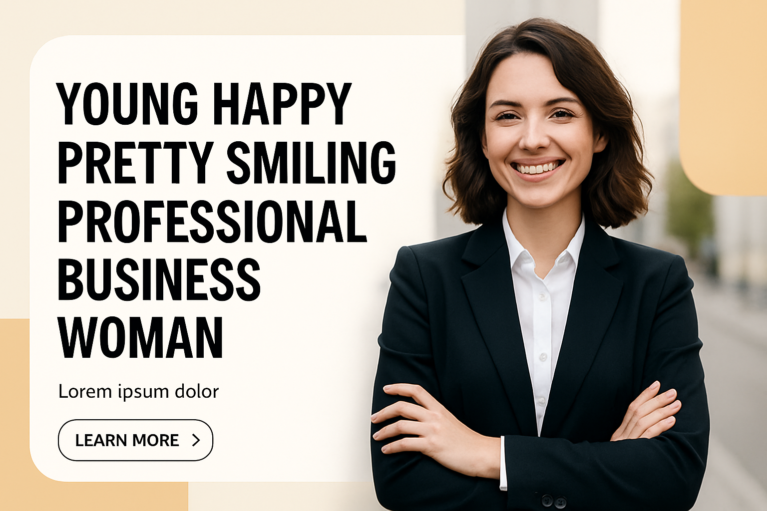 /Collection: /by davooda/Type: PNG/A confident young businesswoman smiles while standing outdoors, arms crossed. The background features geometric blocks and bold typography, creating a modern, professional look.