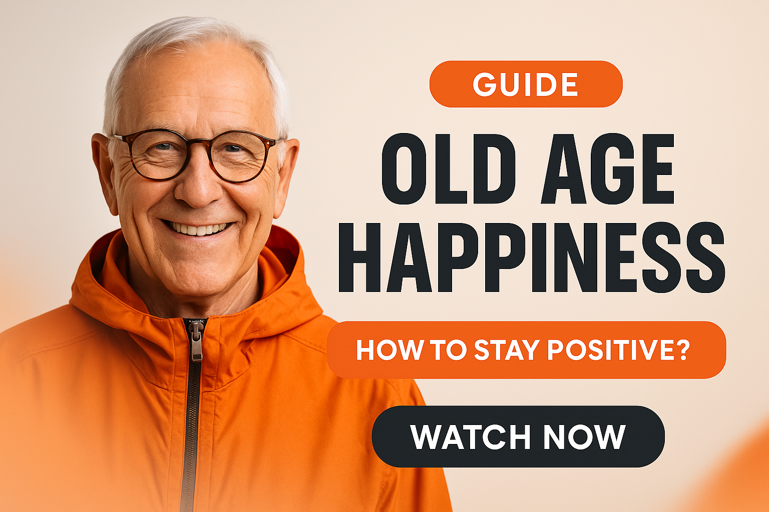 /Collection: /by davooda/Type: PNG/A cheerful senior man wearing an orange jacket and glasses smiles against a smooth gradient background. The design includes motivational text emphasizing positivity in old age.