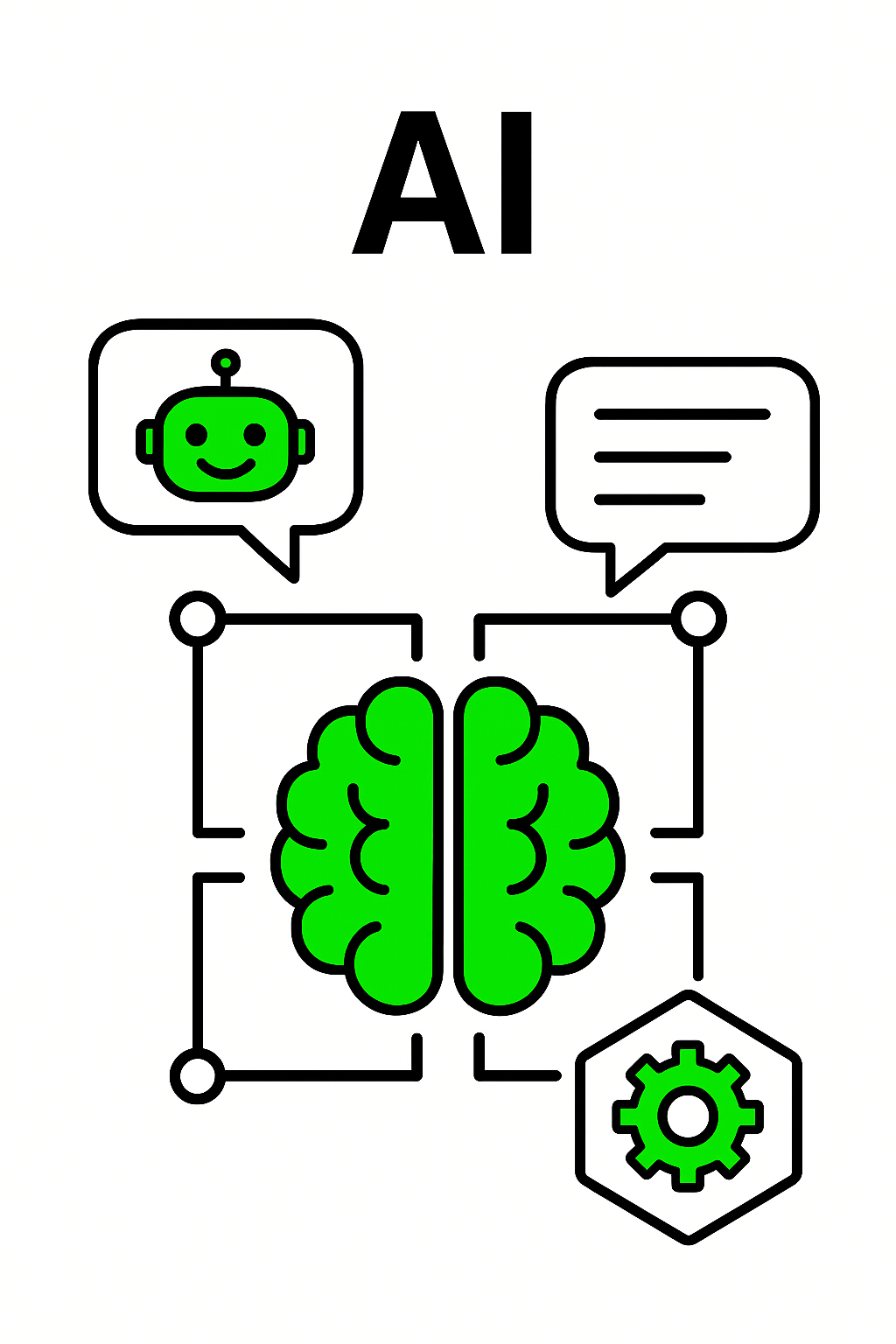 Modern vector-style graphic depicting artificial intelligence with a brain icon, chatbot, and gears, suitable for educational or tech-related content.