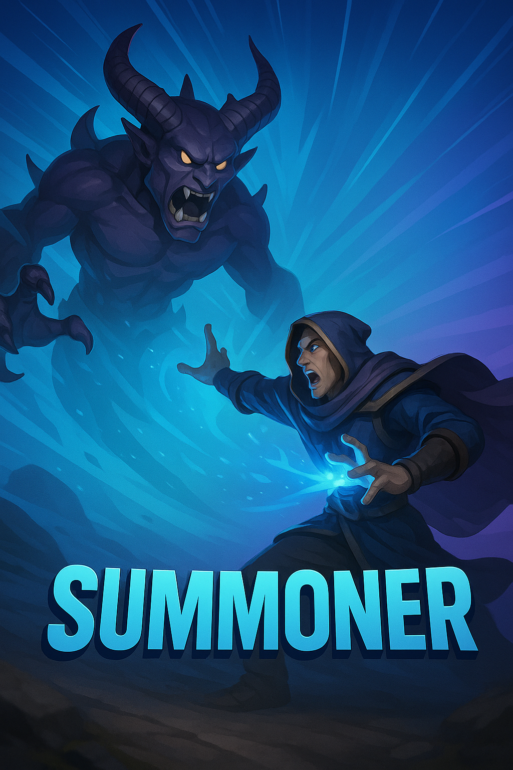 /Collection: /by davooda/Type: PNG/A captivating illustration of a summoner casting a spell, vibrant blue tones dominate the scene. The dynamic background features rays of energy emanating from the summoner, enhancing the magical atmosphere.
