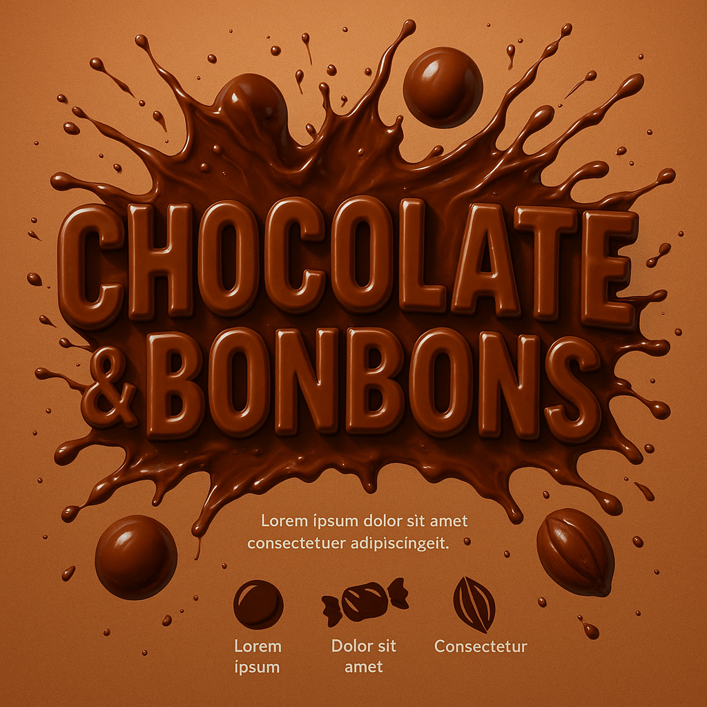 Vibrant graphic featuring bold, glossy typography representing chocolate and bonbons, ideal for confectionery marketing or product promotion.