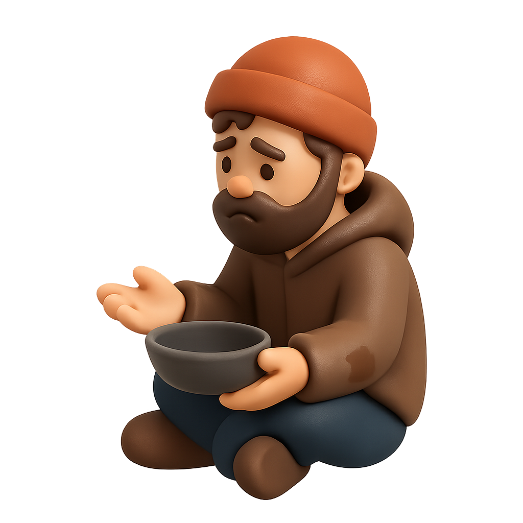 /Collection: /by davooda/Type: PNG/A stylized 3D icon of a beggar in a three-quarter view, featuring a friendly yet somber expression. The character is seated, wearing a beanie and a hoodie, holding a bowl.
