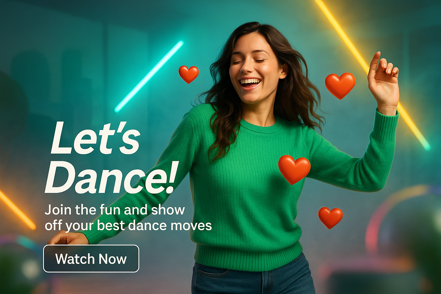 Vibrant promotional banner featuring a joyful dancer with neon lights and heart motifs, designed to attract participants to a dance event or campaign.