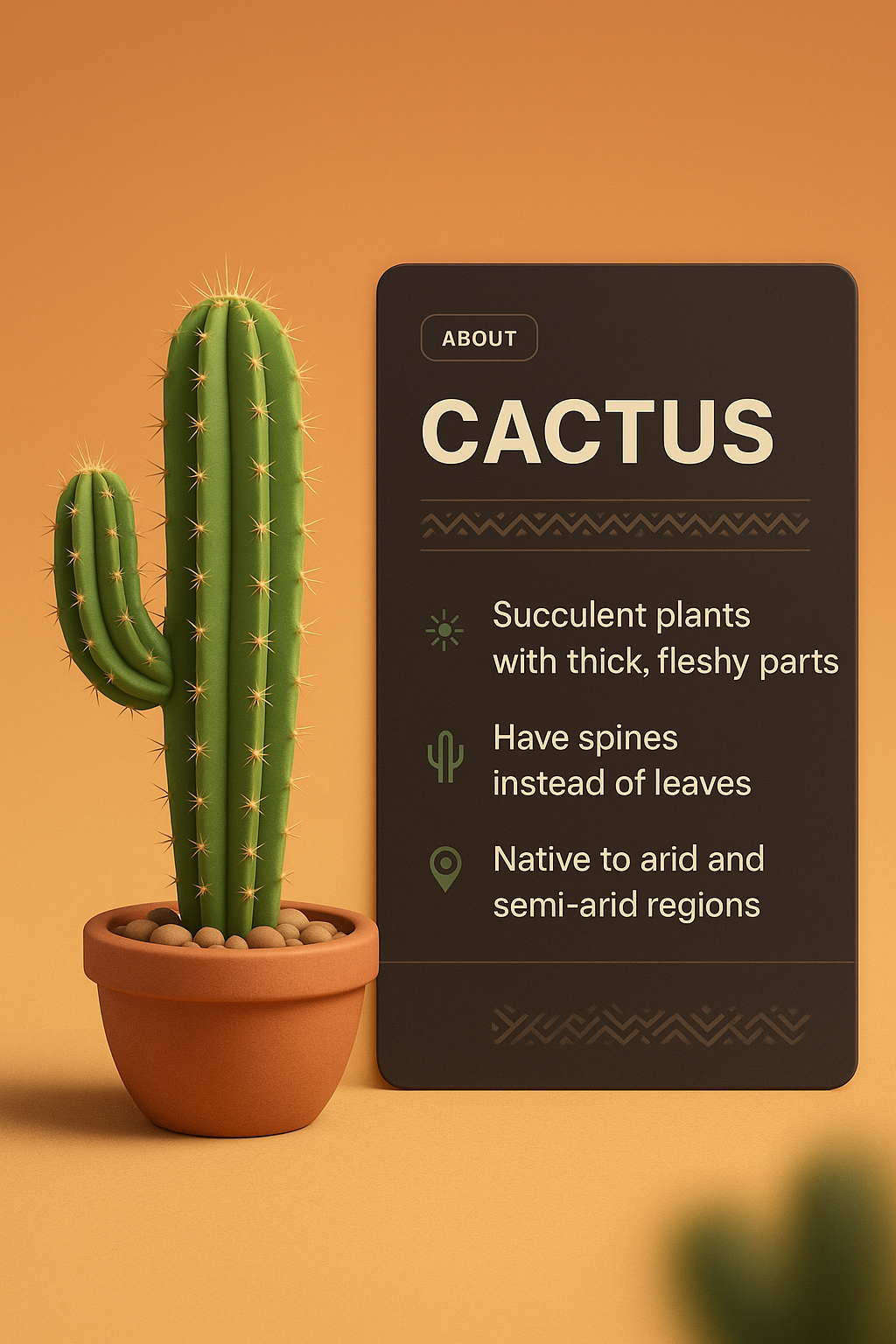 A 3D cactus sits in a terracotta pot against a warm gradient background. An informative dark panel alongside provides details about cacti, enhancing the visual appeal.