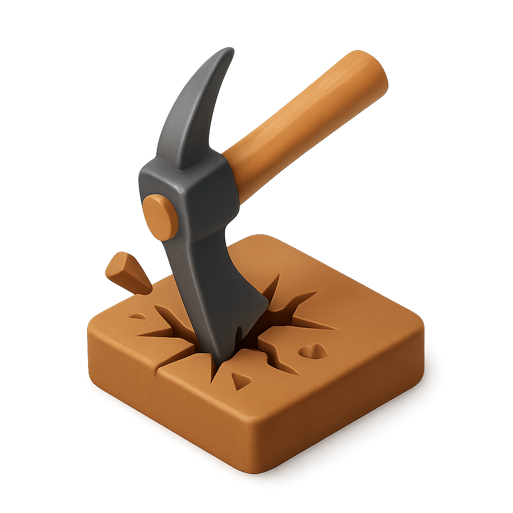 A stylized 3D icon featuring a hammer striking a brown surface, creating cracks. The design emphasizes depth and texture, ideal for digital interfaces.