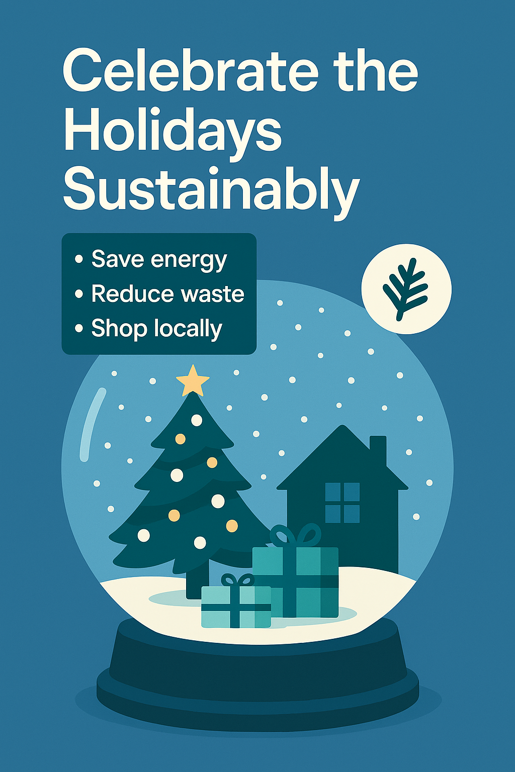 /Collection: /by davooda/Type: PNG/A festive promotional graphic encouraging sustainable holiday practices, featuring a snow globe design with a Christmas tree, gifts, and a cozy house. Ideal for eco-friendly campaigns.