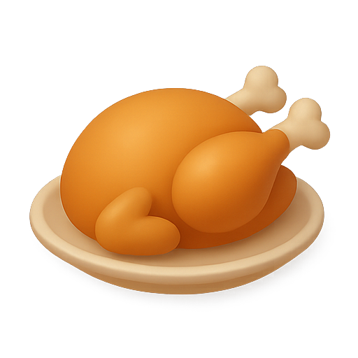 A playful 3D illustration of a cartoon-style roast chicken resting on a plate. The design features soft, rounded shapes and vibrant colors, making it ideal for food-related content and playful branding.