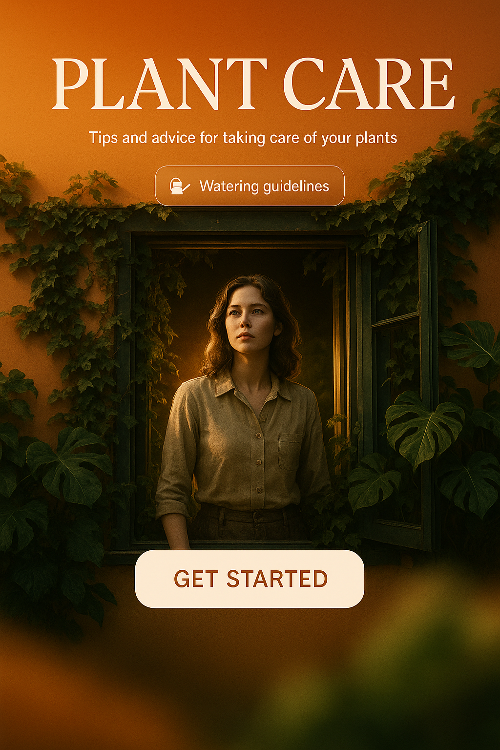 /Collection: /by davooda/Type: PNG/This is a visually appealing social media post featuring plant care tips. It combines a warm color palette with a calming image of a person, aiming to engage plant enthusiasts.