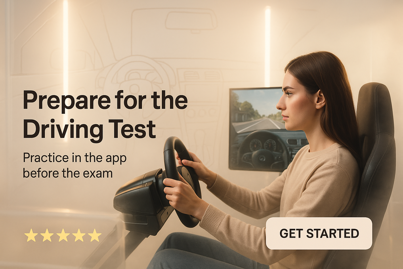 Engaging promotional image for a driving test preparation app featuring a young woman practicing in a simulated driving environment, ideal for app marketing.