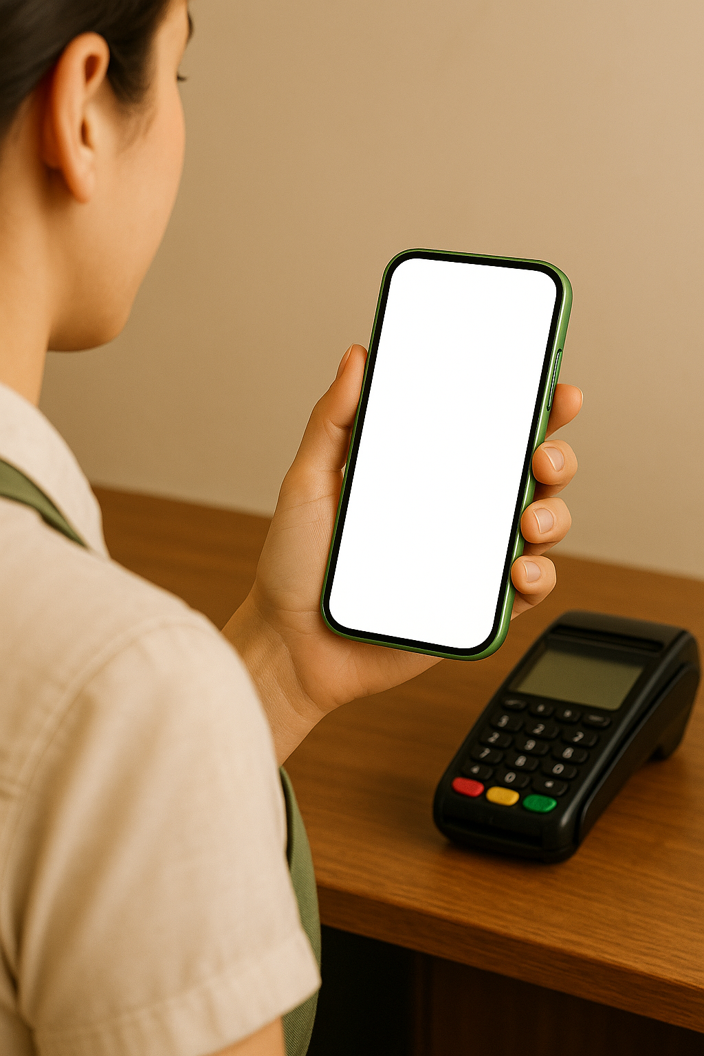 A cashier is holding a green payment phone with a blank white screen, showcasing a dynamic angle from behind the shoulder. A payment terminal is visible on the counter.