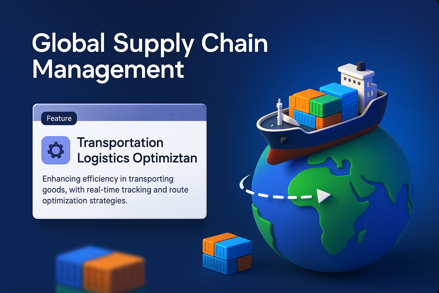 /Collection: /by davooda/Type: PNG/A dynamic 3D illustration depicting global supply chain management with a vessel and cargo containers on a globe, emphasizing transportation logistics optimization features.