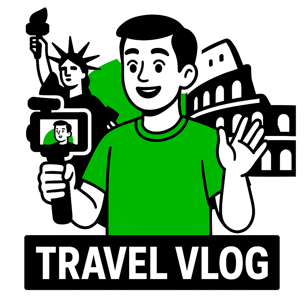 A colorful and engaging graphic representing a travel vlog theme. The design features a character holding a camera with iconic landmarks in the background, ideal for travel-related content.