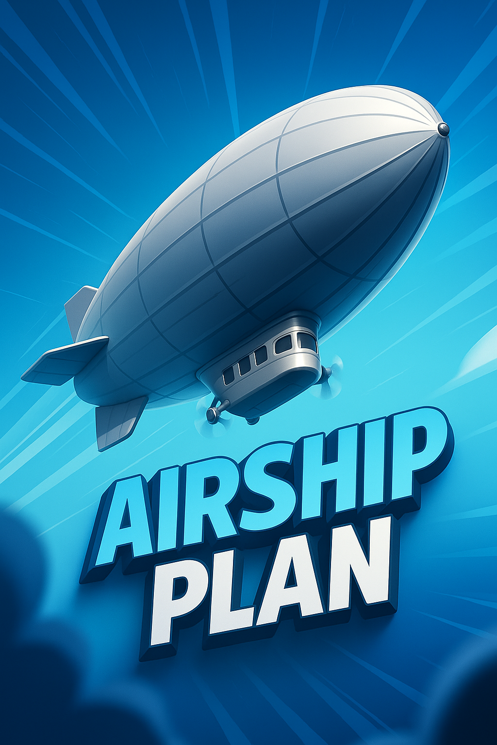 /Collection: /by davooda/Type: PNG/An artistic representation of an airship plan featuring a vibrant blue background with dynamic rays emanating from the center. The airship is prominently displayed, complemented by bold, stylized text.