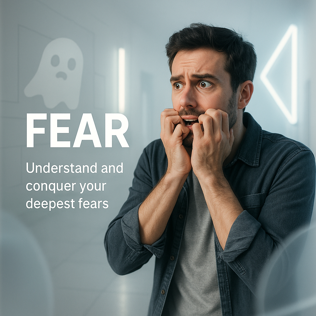 A striking image depicting a man expressing fear, combined with ghostly visuals and modern lighting. Ideal for psychological or self-help themes.