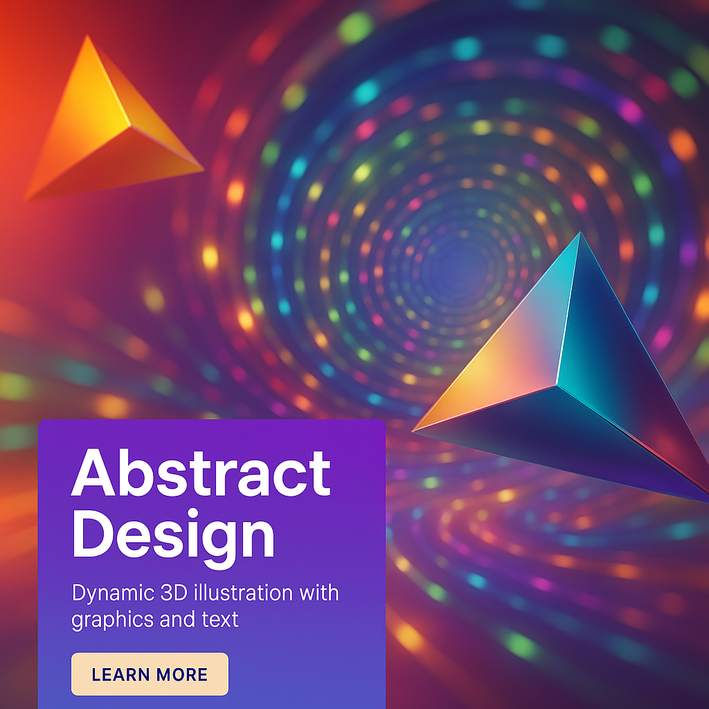 Vibrant 3D illustration featuring geometric shapes against a colorful spiral background, ideal for digital design marketing and creative projects.