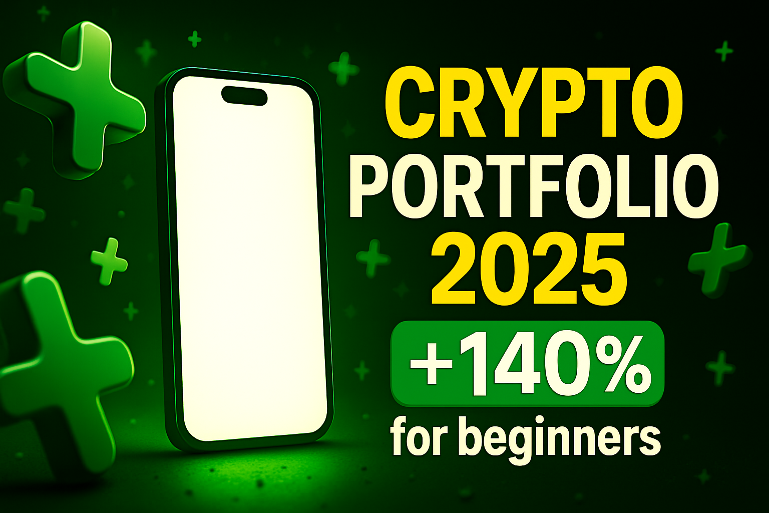 /Collection: , /by Sergey Leonov/Type: PNG/Vibrant promotional graphic featuring a smartphone and bold typography, designed to attract beginners interested in cryptocurrency investments with a focus on portfolio growth.