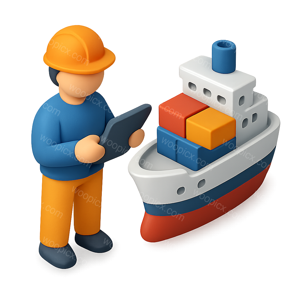 A colorful 3D icon depicting a person holding a tablet next to a stylized ship with cargo blocks. The scene is designed in an isometric view, giving it a volumetric feel.