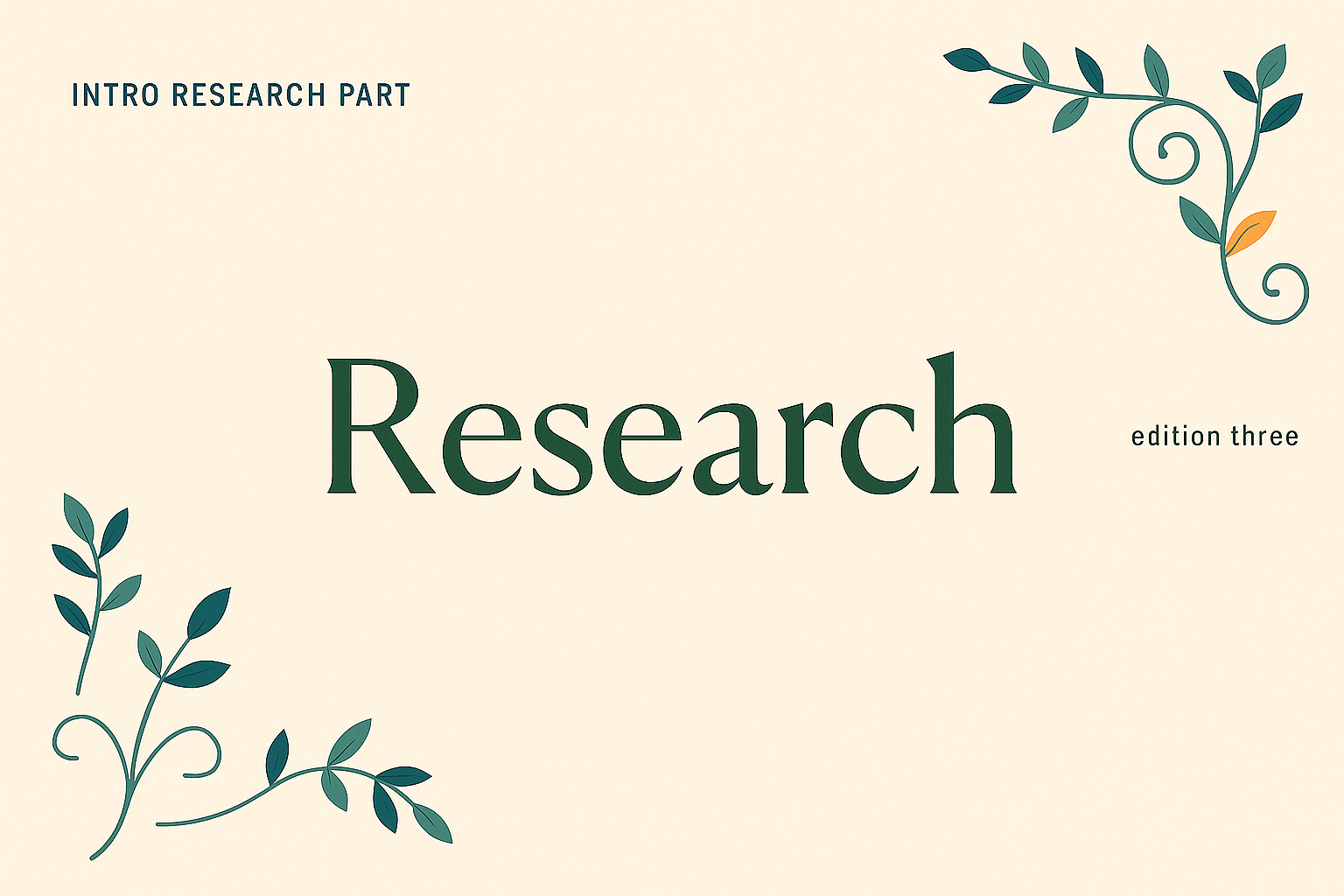 A visually appealing layout showcasing the word 'Research' in a stylish font, surrounded by delicate botanical illustrations in a three-color scheme.