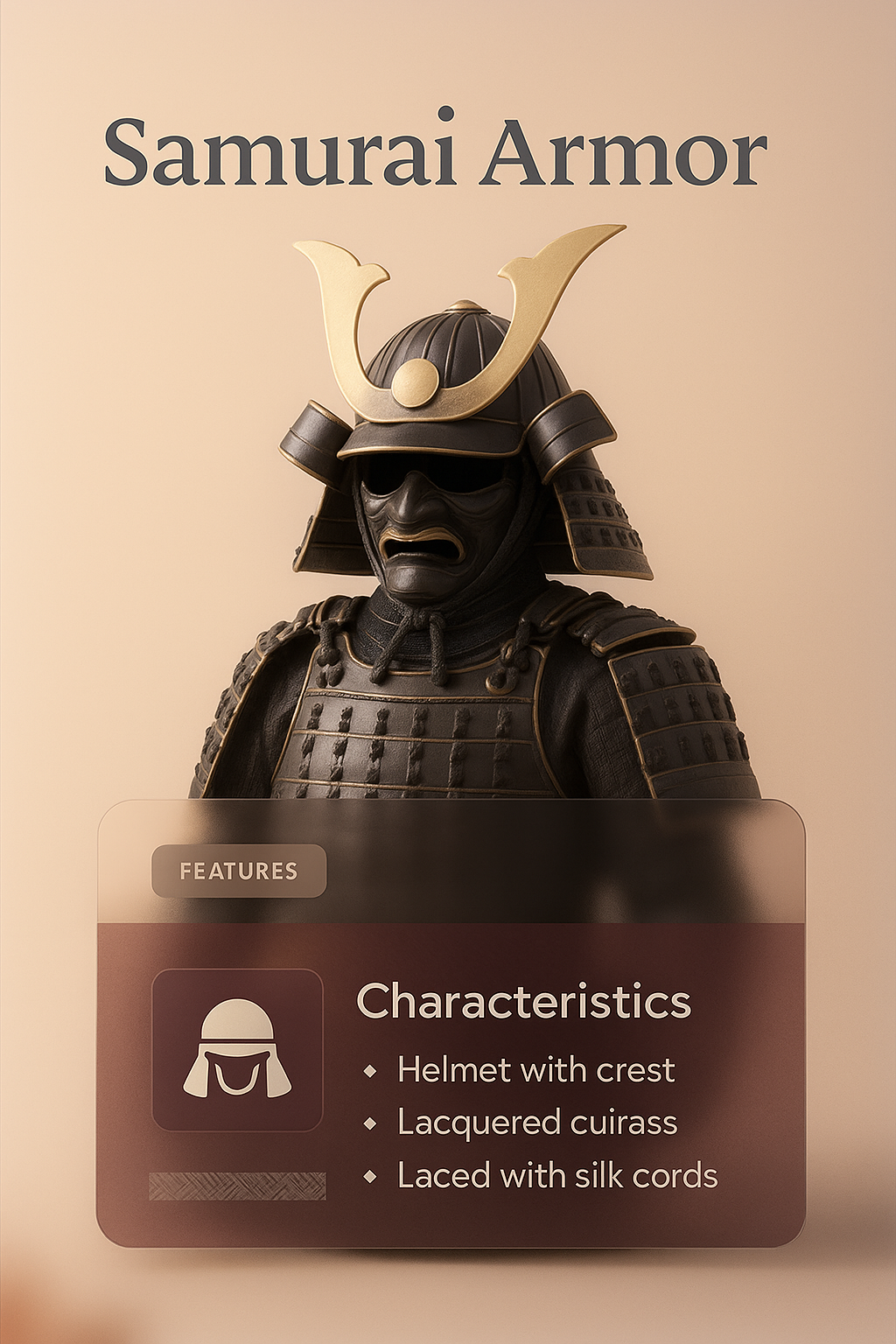 /Collection: /by davooda/Type: PNG/A captivating 3D illustration of samurai armor featuring a detailed helmet and lacquered cuirass. Accompanied by a translucent panel highlighting its characteristics.