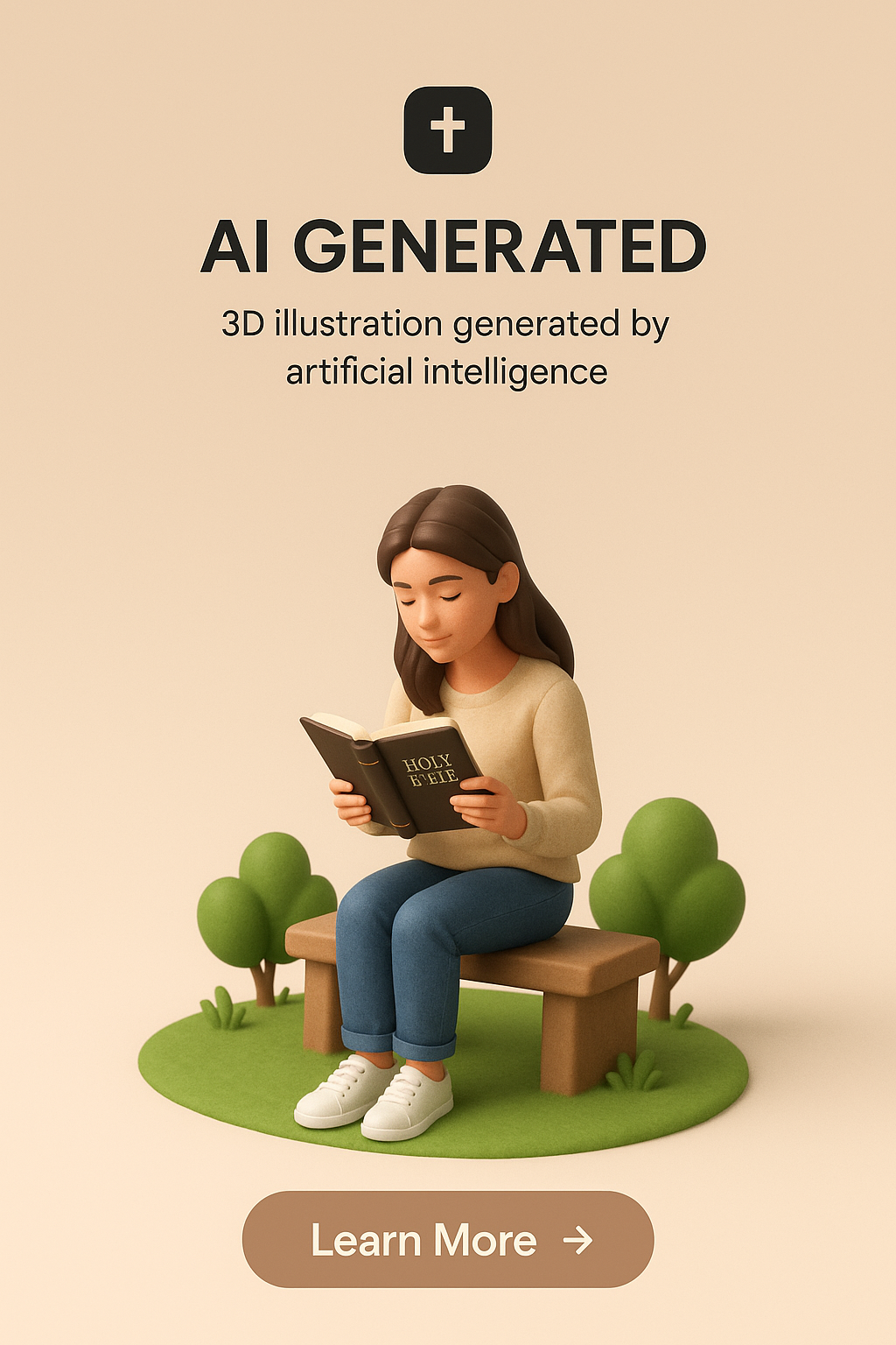 A realistic 3D illustration of a young woman seated on a bench, reading a Bible. The background features a smooth gradient, enhancing the serene atmosphere of the scene.