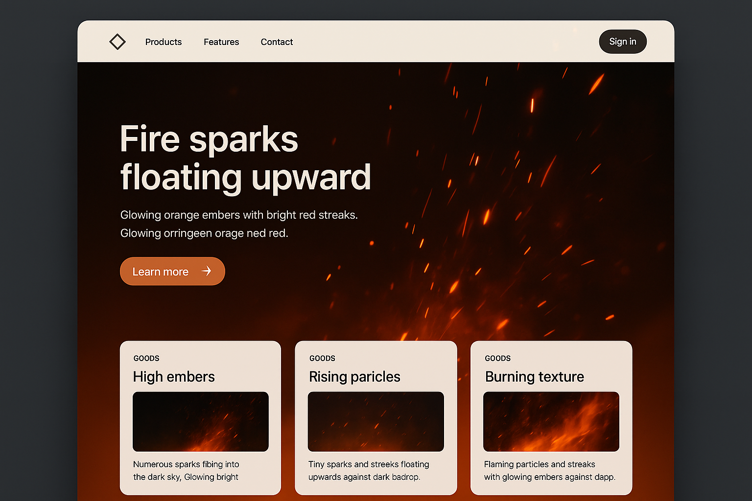 /Collection: /by davooda/Type: PNG/A visually striking landing page design featuring fire sparks floating upward on a dark background. The layout includes sections for products and features with a focus on glowing orange embers.